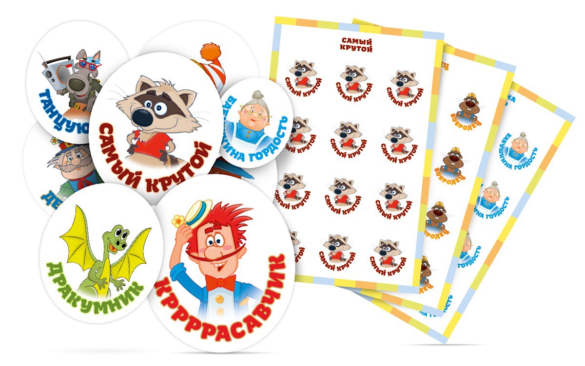 Наклейки сделаны для решения задач детских специалистов: наградить за успехи, поощрить усилия, показать родителям достижения ребенка. Поэтому помимо картинки на наклейках написаны мотивирующие слова: «Бабушкина гордость», «Лучше всех», «Все получилось».