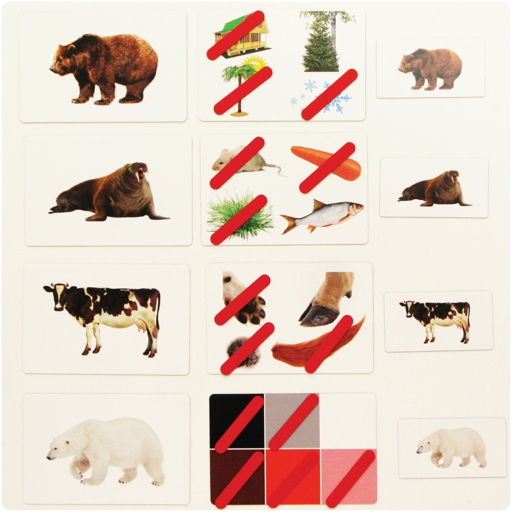 Перед началом игры нужно раздать ребятам маленькие карточки с животными (можно по несколько штук) и познакомить их с карточками-схемами.