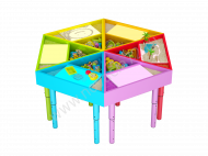 6 треугольных приставных столика — трансформера. Столы имеют световой планшет для рисования песком, а так же, три отсека: Для песка, формочек и игрушек. Материал ЛДСП. Подсветка световых планшетов - 16 цветов 3 режима. Ножки телескопические c регулировкой высоты.