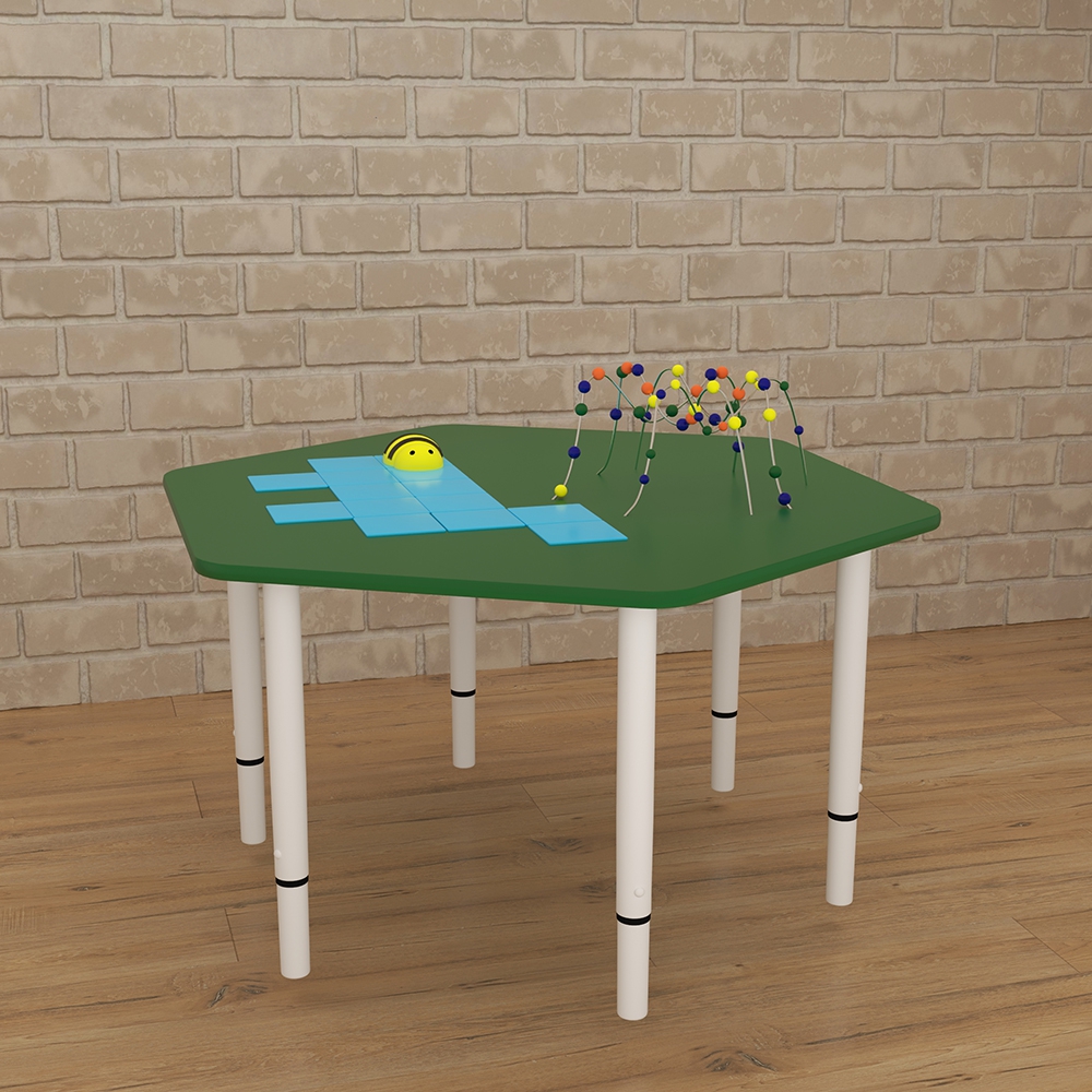 Игровой стол “Маленькие горки” специально разработан для развития мелкой моторики у детей 1-6 лет в форме игры. На шестиугольной столешнице правильной формы размещены металлические направляющие, которые изогнуты в разных направлениях; по ним можно перемещать закреплённые разноцветные шарики. В качестве опоры выступают 6 устойчивых ножек, которые могут выдвигаться, увеличивая или уменьшая высоту стола. Весь стол окрашен в яркие оттенки. На поверхности столешницы также есть поле для игры с пчёлкой.