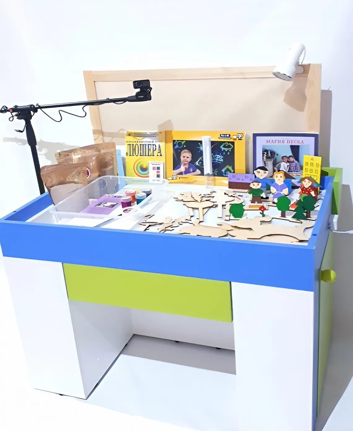 2. Многофункциональный дизайн. Рабочая область для рисования песком трансформируется в полноценный стол благодаря откидной крышке, что позволяет эффективно использовать пространство.
