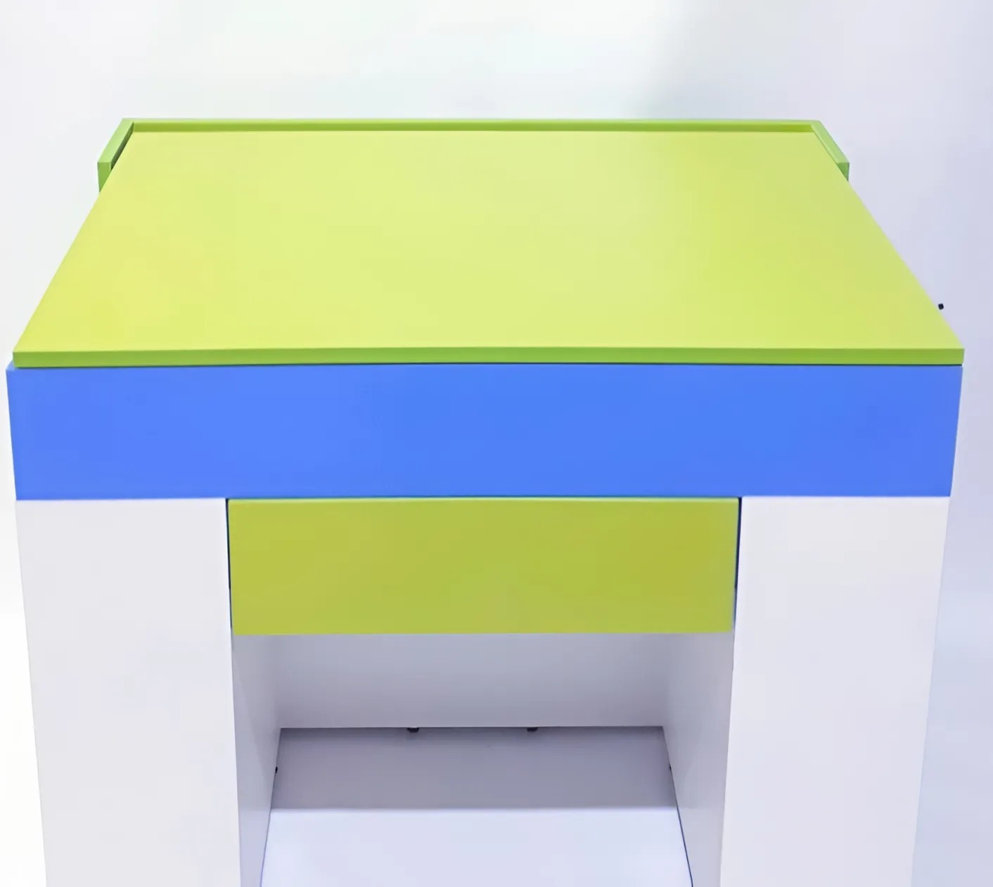 Универсальный модуль для рисования песком, акварелью, театрального, логопедического и психологического развития выполнен в ярких и красочных тонах. Он представляет собой целостную нераздельную конструкцию в виде стола со встроенной светодиодной подсветкой, имеющей функцию переключения цветов и оттенков и технологическими полостями для хранения комплектующих и расходных материалов, входящих в комплект.