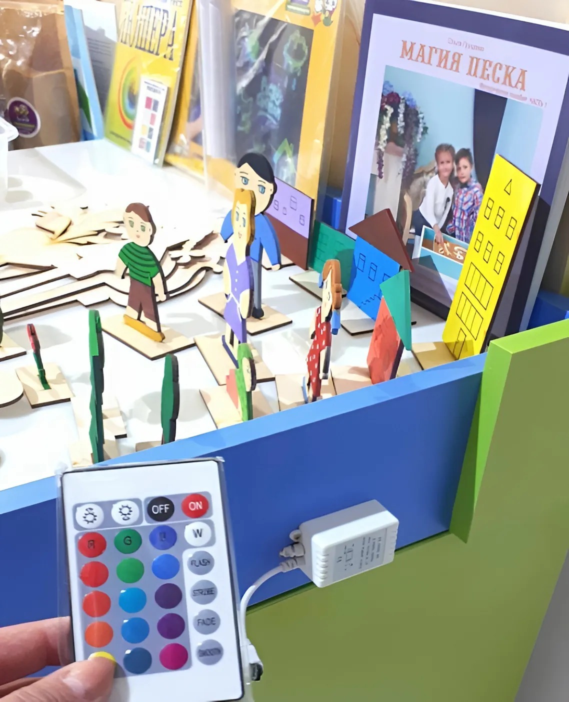 6. Разнообразие творческих материалов. Комплект включает технику эбру, набор для песочного рисования, театр теней, сценарии сказок и аксессуары для рисования, что даёт широкий простор для занятий.