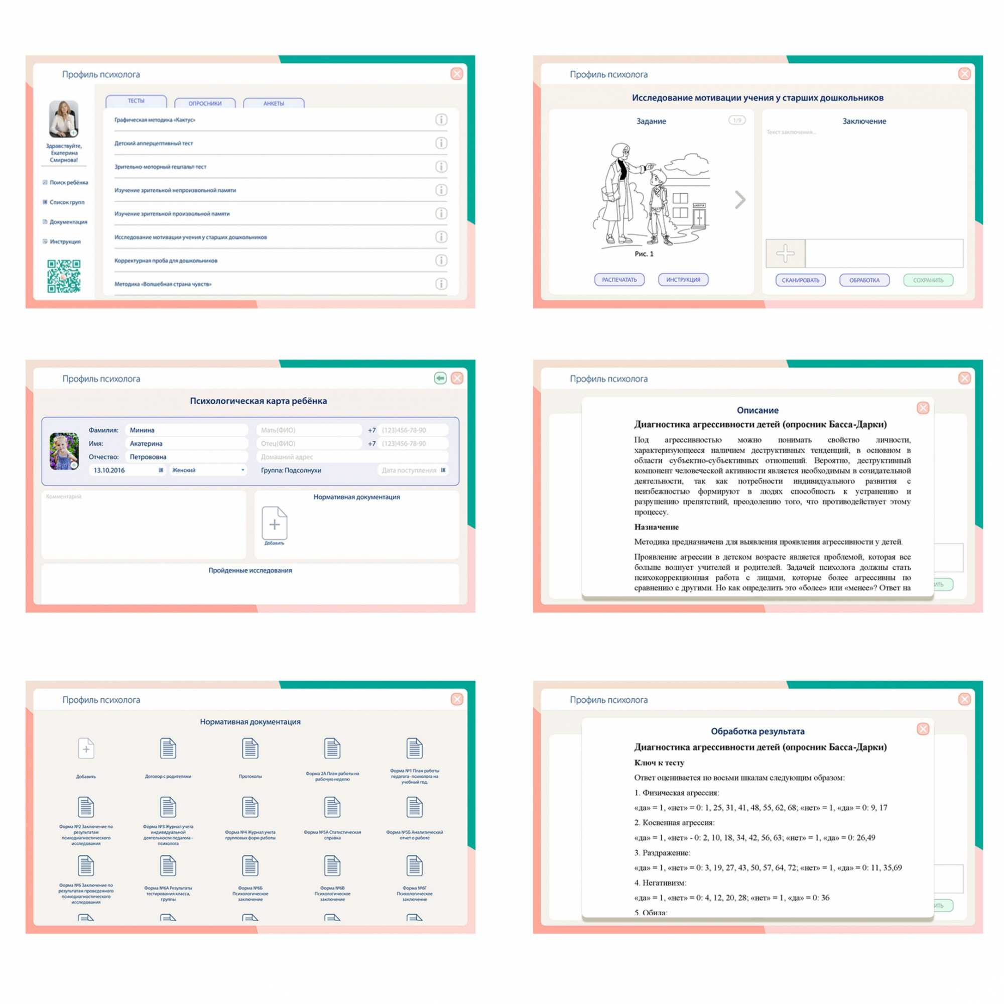 Тесты: Графическая методика «Кактус», Детский апперцептивный тест, Зрительно-моторный гештальт-тест Лоретты Бендер, «Изучение зрительной непроизвольной памяти», «Изучение зрительной произвольной памяти», «Корректурная проба для дошкольников», Методика «Волшебная страна чувств», Методика «Домик», Методика «Запоминание 10 слов», Методика «Запомни и расставь точки», Методика «Отгадывание загадок», Методика диагностики детских страхов и еще более 50 тестов.