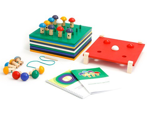 9 цветных «столиков-полянок», 36 съёмных ножек для столиков, 1 «полянка» со штырьками, 45 грибочков, 4 корзинки,деревянная иголка со шнурком, игрушка «Белочка», фирменная сумка, методическое пособие «Коррекционно-педагогическая работа по сенсорному развитию детей дошкольного возраста», методическое руководство поиспользованию набора.