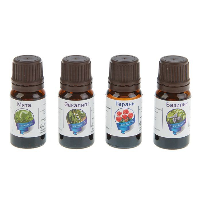 Масла эвкалипта, базилика, герани, мяты, расфасованные по 10 мл, упакованные в коробку и сопровождающиеся индивидуальными аннотациями.
