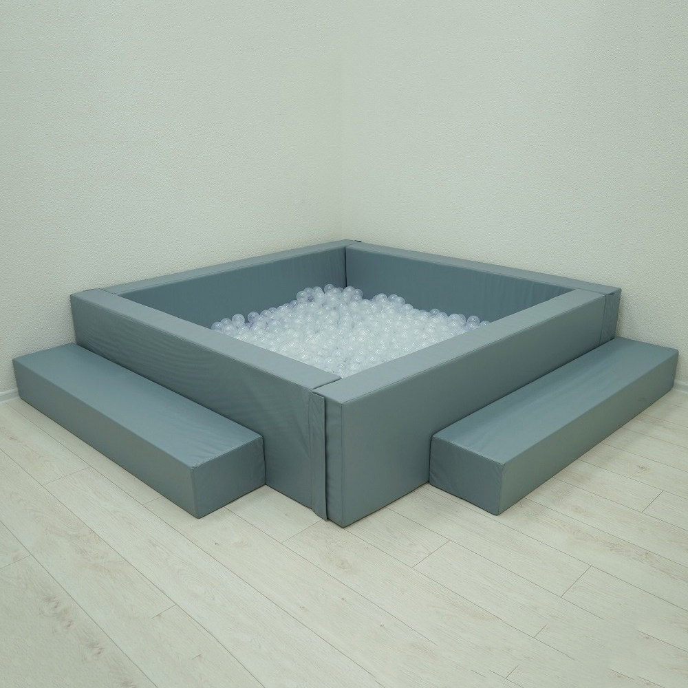 Мягкий квадратный манеж, наполненный прозрачными шариками. Предназначен для детских комнат в ДОУ, а также для оснащения сенсорных комнат и кабинетов детских психологов.