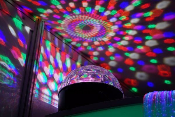 Выполнен в виде полусферы с прозрачными гранями. Многолучевой эффект. Проецируется на стены и потолок.  Питание от сети 220В