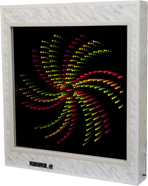 Имитация вращающегося разноцветного колеса на темном фоне с многочисленными внутренними переотражениями. Имеется возможность управлять цветами колеса, его видом, скоростью вращения и режимами.правление на лицевой панели сенсорными датчиками (срабатывают от прикосновения).