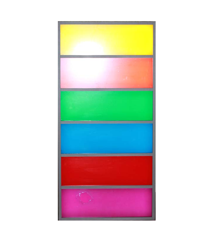 Размер 112х55х20см. 6 ячеек. В зависимости от громкости звука загорается разное количество ячеек. Материалы: ЛДСП, акрил.