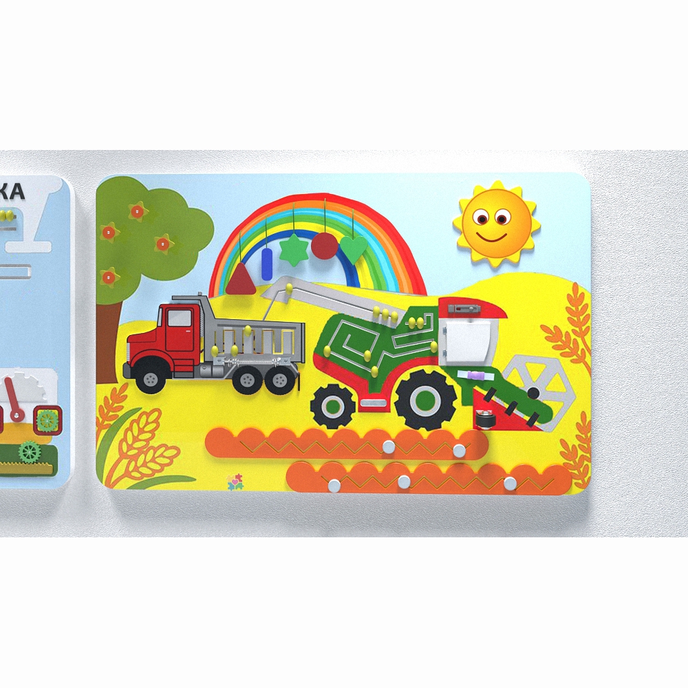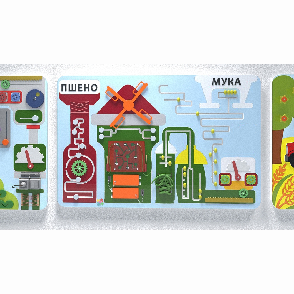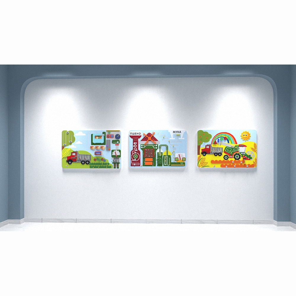 Комплект настенных панелей «Хлебокомбинат» отображает работу настоящего комбината по производству хлебопродуктов и все её этапы – от сбора урожая в поле до транспортировки готовой продукции в магазины. На панелях имеются и другие приспособления для развивающей детской игры.