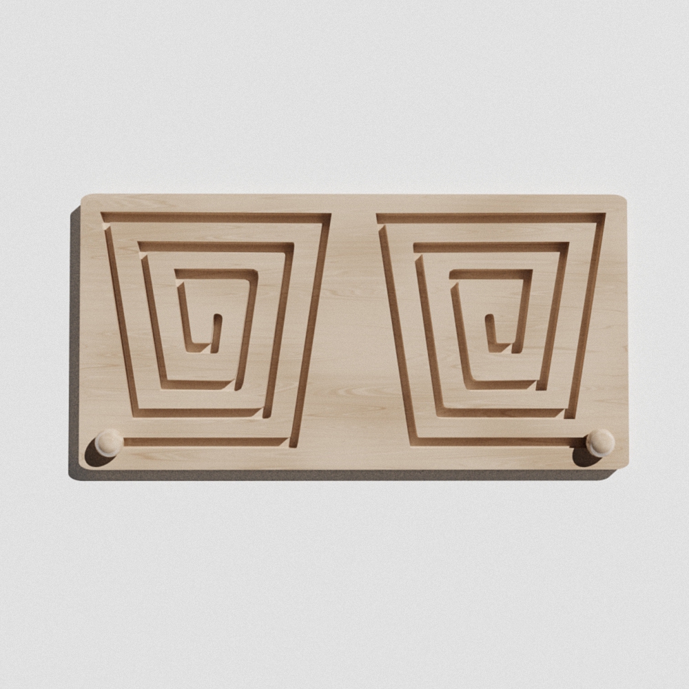 Малышу необходимо взять два бегунка и установить в лабиринте. Сначала двигать кружок по маршрут правой, затем только левой рукой, а после двигаться по траектории лабиринта обоими одновременно по часовой стрелке, а потом против. Упражнение помогает сформировать одновременную работу рук, глаз и обоих полушарий.