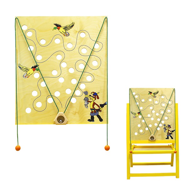 Игровая панель размером 57 х 68 см., красочно изображены персонажи: слева сбоку лев, снизу справа – охотник и вверху – его замок. Внутри панели сделаны круглые сквозные прорези и нанесен рисунок охотничьей тропы, по которой нужно провести «охотника», спрятавшегося в укрытие, к логову «льва». У «охотника» имеется «пуля» – это может быть шарик или колечко. «Охотник» в «укрытии» с пулей – это полая треугольная формочка с шариком внутри, подвешенная снизу на 2 шнурах.