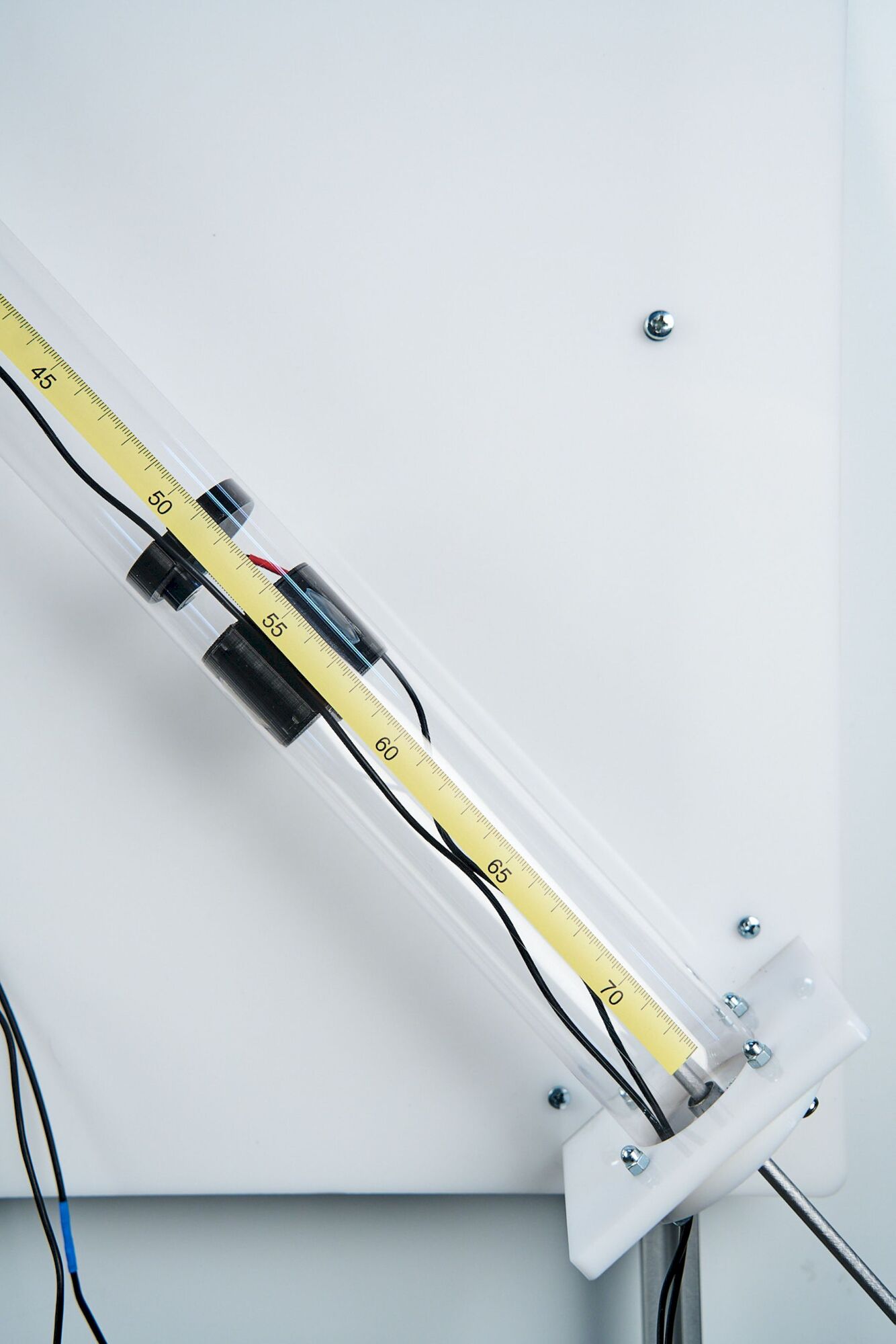 На каркасе из металлических труб установлена звуковая труба, в которой реализуется распространение звуковой волны и обеспечивается измерение скорости звука двумя методами. Контроль параметров звуковой волны в двух точках пространства осуществляется с помощью двухканального датчика звука, имеющего два микрофона. Конструкция установки позволяет перемещать одиниз микрофонов вдоль трубы и определять его координату по специальной шкале. Источником звука служит динамик, который под ключается к USB-порту компьютера и управляется с помощью программного обеспечения.
