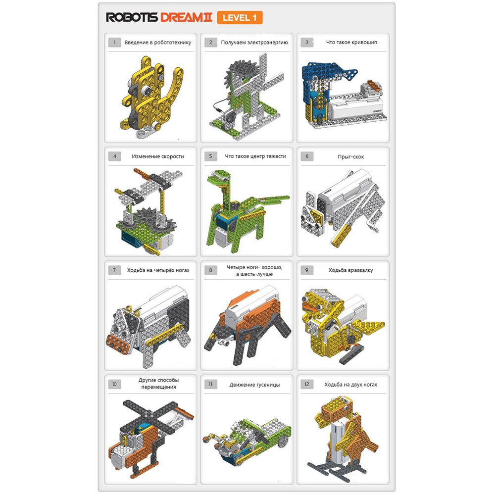 С помощью DREAM II Level 1 можно ознакомиться с основами гравитации, выработки электричества, силы, а также передвижения. Из комплекта получается несколько симпатичных зверушек, зданий и транспортных средств. Животные-роботы могут передвигаться на двух и четырех ногах. Самостоятельно собирая фигурки, ребенок может изучить то, как распределяется гравитация в природе, от чего зависит её центр и на что он влияет, а также получить представление об основных способах скрепления деталей для сохранения их подвижности. В этот набор вошли только базовые элементы ROBOTIS, что делает его отличным первым конструктором для ребят, которые интересуются инженерией и техникой.