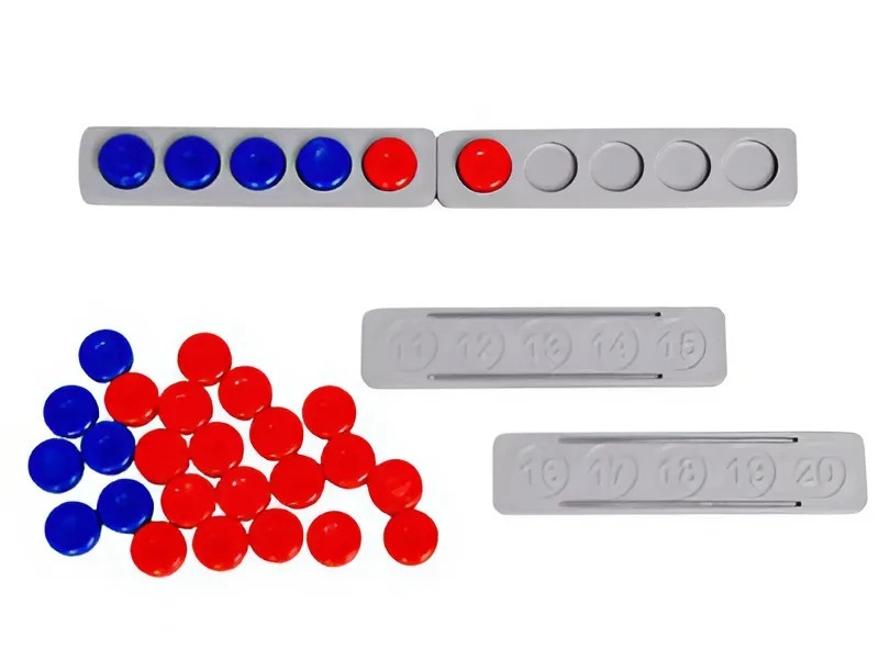 Счетный материал изготовлен из пластмассы, укладывается в удобную коробку с крышкой. На одной стороне корабликов расположены гнезда для фишек, на другой нанесены числа.