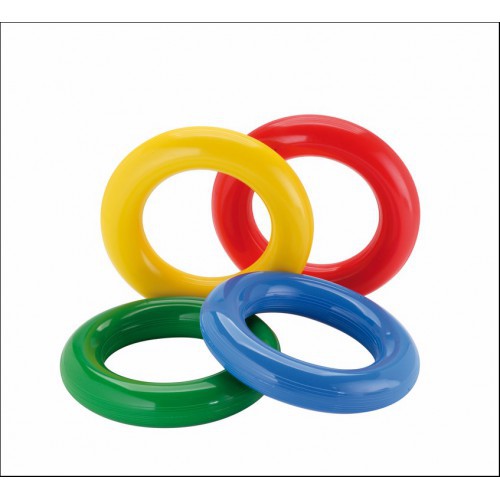 Кольца выполнены из качественной гладкой резины, не имеют неприятных запахов, резина не содержит фталатов и латекса. Диаметр кольца 18 см, в комплекте четыре кольца разных цветов красный, желтый, синий, зеленый.
