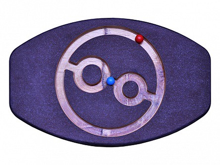 Балансировочная доска-лабиринт представляет собой планшет в форме круга, снабженный эргономичными подножками для управления движением игрового шарика в процессе балансирования и полусферической опорой. Игровое поле панели снабжено сетью бороздок прямоугольного профиля в форме ортогонально-синусоидального лабиринта.