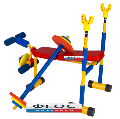 Универсальная детская скамья для работы со штангой и нагружаемым керлом для ног. Штанга входит в комплект. Эргономика тренажера специально разрабатывалась для детей. Имеет прочную и устойчивую конструкцию. Стойки имеют регулировку вылета. Диски (веса) штанги выполнены из полиуретана, что делает тренировки безопасными.