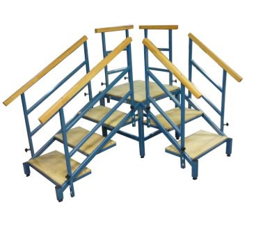 Лестница для обучения ходьбе состоит из платформы, двух съемных лестничных блоков, которые монтируются к платформе как прямо, так и под углом 90 градусов. Блоки отличаются количеством лесенок (2 и 3) и расстоянием между лесенками (высотой ступенек). Лестничные блоки и платформа снабжены поручнями с обеих сторон. Поручни регулируются по высоте.