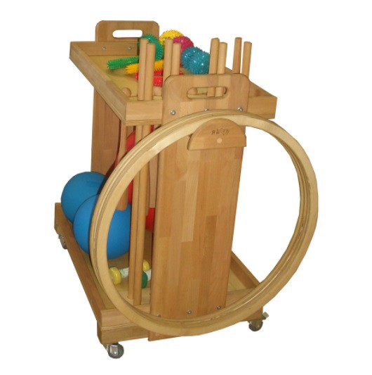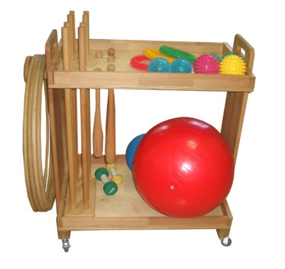 Тележка из натурального дерева на колесах с тормозами. Предназначена для хранения гимнастических снарядов для занятий лечебной физкультурой в условиях специализированных реабилитационных и гимнастических залов.