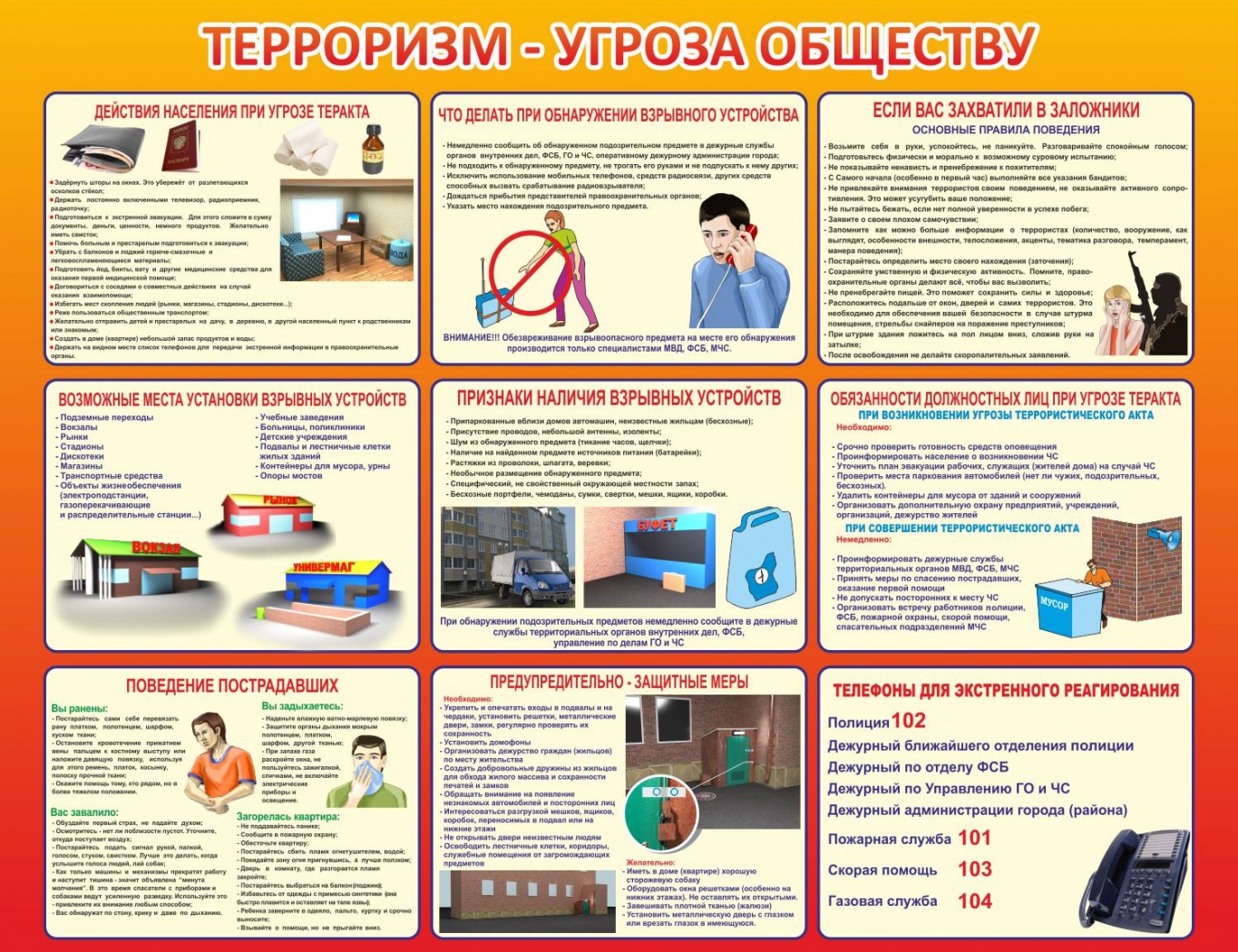 В наше время, к сожалению, такое явление как терроризм пугает не только своим словом, но и действием. Школьники должны понимать, насколько это ужасно и опасно. Стенд «терроризм угроза обществу» ознакомит учеников и учителей с видами терроризма и его последствиями. На стенде имеются 9 разделов с полезной информацией и небольшими иллюстрациями по каждой теме. Такой стенд должен разъяснить людям, как вести себя в той или иной ситуации и что всем присущая паника в некоторых случаях может привести к летальному исходу. Стенд сделан из качественного пластикового листа, которой имеет очень легкий вес, поэтому стенд можно легко установить или перевесить.