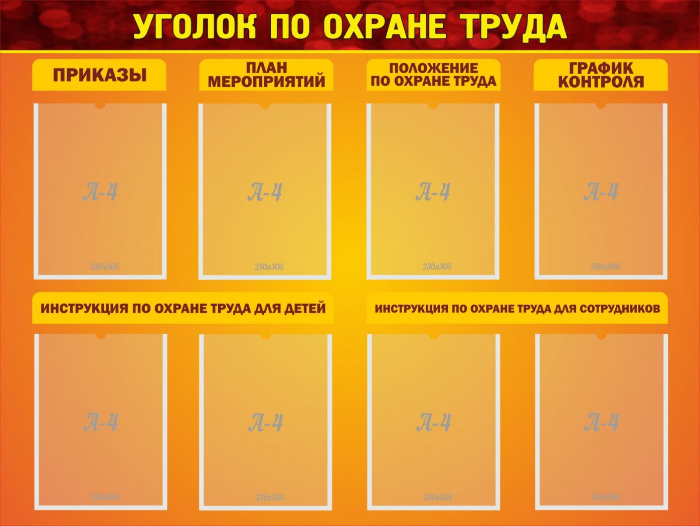 Такой стенд совмещает в себе все необходимые листы или документы по методическому процессу школы. Тут можно вывесить и приказы, и планы мероприятий, и графики контроля и даже инструкции по охране труда для детей и сотрудников. Стенд имеет 8 удобных карманов для бумаг формата А4, так же все карманы разделены по названиям категорий информации. Такой стенд можно повесить в коридоре школы, чтобы каждый мог быть проинформирован о нужной информации. Яркий цвет стенда и отсутствие разных рисунков и изображений – все это нацелено на привлечение школьников и сотрудников к важным объявлениям по охране труда.