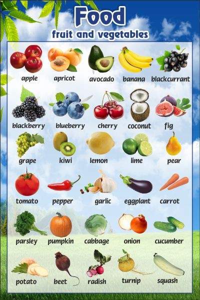 Раздел «Фрукты и овощи» - один из самых главных в теме «Еда» при изучении английского языка. Качественная и яркая наглядность поможет детям запомнить название самых распространённых в России и Англии овощей и фруктов. Черешня и кокос, лимон и бананы, тыква и свекла - ровно 30 наименований овощей и фруктов с яркими и сочными иллюстрациями к ним. С такой наглядностью детям будет учиться приятно и легко.