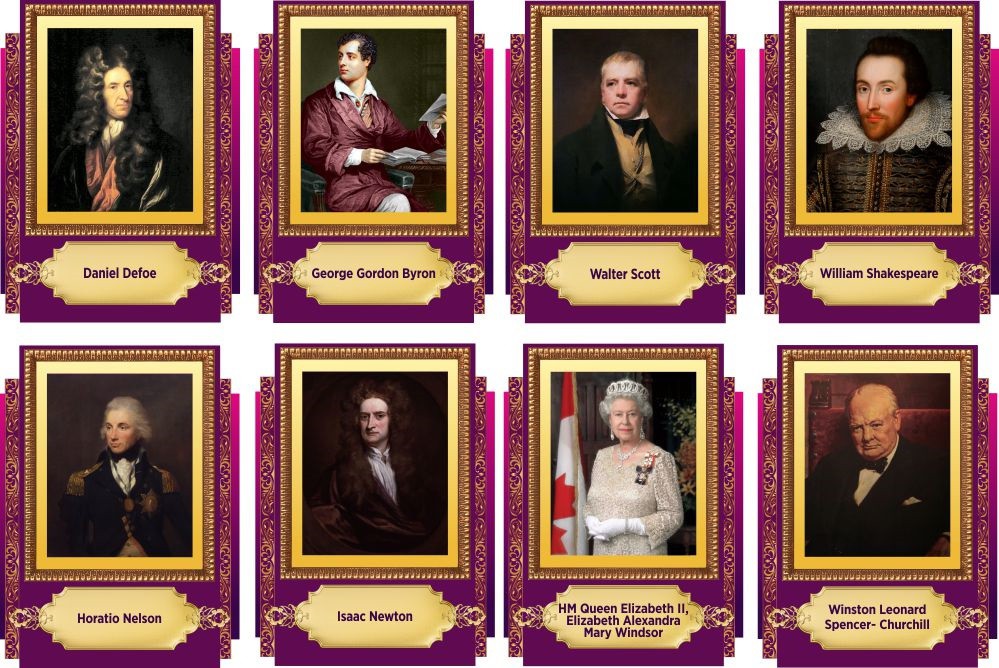 Политик Уинстон Черчилль и королева Елизавета II, писатель лорд Байрон и Вальтер Скотт, командующий Горацио Нельсон и журналист Даниэль Дефо – собрали вместе тех, кто внес самый значимый вклад в развитие английской и мировой культуры.