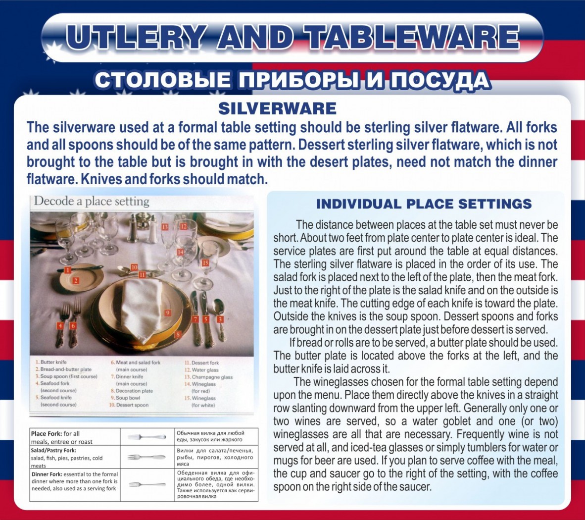 Очень важно, чтобы ученики могли не только знать, как переводится на английский слово "ложка" или "вилка", но и могли спокойно рассказать, как переводятся другие столовые приборы, как правильно сервируется стол, чем и как есть то или иное блюдо. На этом стенде ученики смогут найти всю интересующую информацию о этикете за столом. Благодаря такому стенду ученики не только смогут взять нужную вилку или ложку, но и будут уверенно показывать свои хорошие манеры за столом. Такой стенд будет украшением любого класса, а его информация поможет, как и юным ученикам, так и ученикам, которые изучают язык давно.