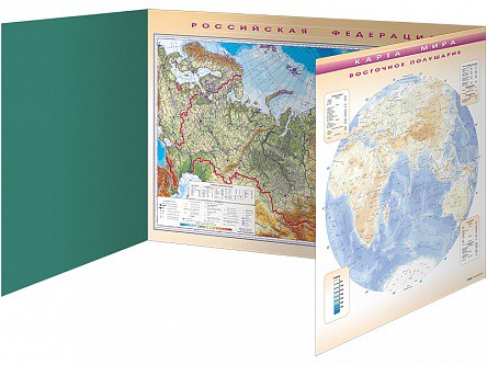 Магнитно-маркерная доска представляет собой совокупность основной доски, на которой изображена географическая карта Российской Федерации, и двух створок с изображением западного и восточного полушарий.