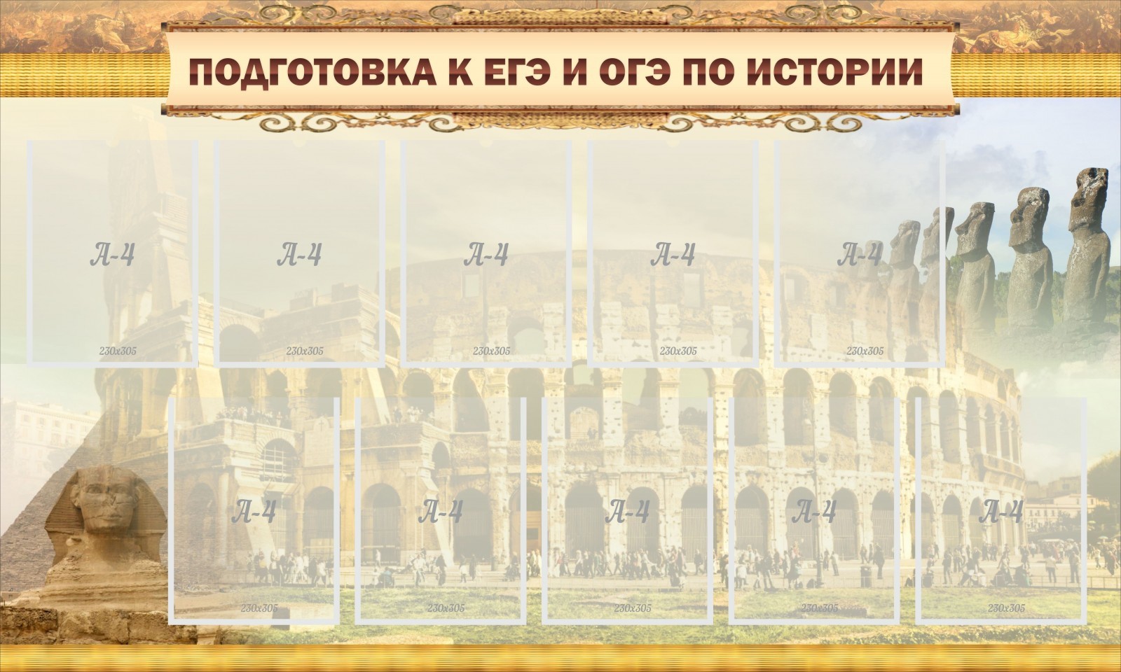 В том случае, если ищется отличный стенд с десятью карманами A4, в которых можно поместить всю необходимую информацию, по подготовке к ЕГЭ и ГИА по предмету «история», он всегда найдется! И этот замечательный стенд только подтверждает данное правило. Удобные карманы и приятнейший дизайн, умело сочетаются. Если близки экзамены, которых боятся совершенно все учащиеся, нужно помочь им, даровав запросто, подробные сведения по теме, помещенные в кармашки стенда. Да, даже при экзаменах, которые ожидаются нескоро, школьникам следует заглядывать в источники подробной информации, о предстоящем «мучении».