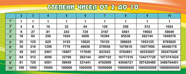 Стенд "Степени чисел от 2 до 10"