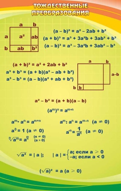 Строгое и серьезное объяснение по теме тождественных преобразований, дано на этом стенде. Но, чтобы хоть как-то компенсировать сложность указанных формул и фигур, информация дается на невероятно ярком фоне. Такой стенд будет только лишь в пользу учителю, так как школьники станут быстрее стремиться понять, сказанную преподавателем информацию, и запомнить ее. Множество достойных примеров, благодаря которым любой ученик, сможет лучше ориентироваться в теме. Ведь школьникам важно ощущение себя «рыбой в воде», если речь идет о «морских глубинах» математики. Одного учебника мало, если школьник сидит в кабинете, а не у себя дома.