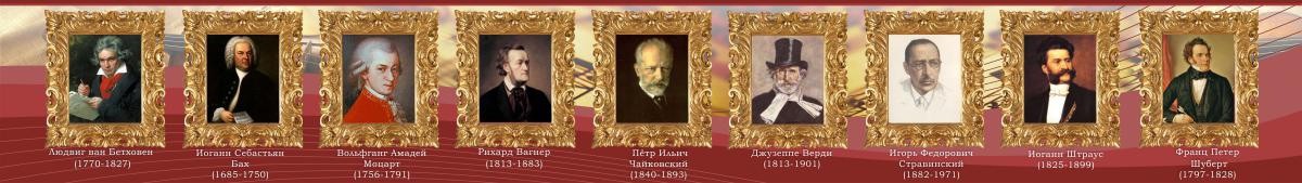 Девять портретов величайших деятелей музыкального поприща за всю мировую историю, представлены на этом стенде. И неплохо бы выучить, если уж ни годы их жизни, то хотя бы век, в котором они жили, и их имена. Такой стенд как раз-таки и побудит учеников, серьезнее относиться, как к музыке в целом, так и к великим композиторам и музыкантам, в частности. В золоченых рамках портреты, как и весь дизайн роскошного стенда, приятен для глаз и подталкивает к быстрому, но качественному, запоминанию, главной темы. Возможно, кому-нибудь из учеников, даже удастся выучить наизусть, годы жизни и имена величайших композиторов и музыкантов, благодаря этому прекрасному стенду.