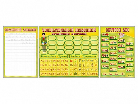 Комплект оборудования представляет собой совокупность электрифицированного стенда "Немецкий алфавит", тематической доски "Увлекательный немецкий" и маркерной доски.