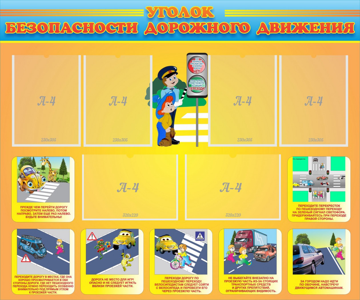 Каждый ребенок должен знать, как правильно переходить через дорогу. Жизненно необходимой эта информация будет жителям мегаполиса. Стенд имеет выгодный дизайн. В нем органично сочетаются карманы для размещения информации, расположенные в верхней части стенда, с наглядными картинками, которые присутствуют в нижней части стенда. Светофор покажет детям, на какой свет можно переходить через дорогу, а когда необходимо подождать. Также, на стенде размещена основная информация о ППД: как необходимо переходить через дорогу, в какую сторону сначала надо посмотреть, можно ли перебегать через дорогу и многое другое.