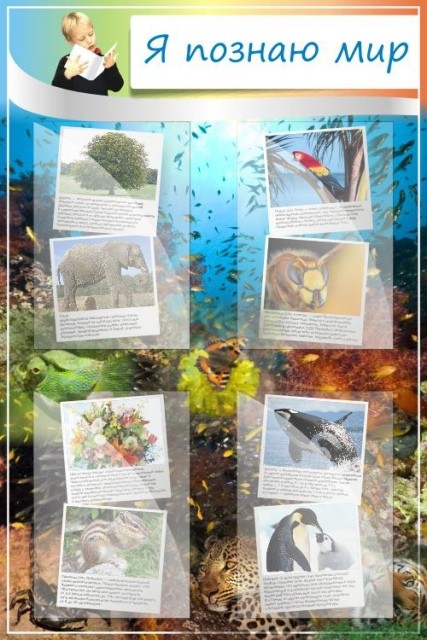 Отличный, очень яркий и красивый стенд! Он способен достойно украсить стену в кабинете любого начального класса. Здесь подводный мир и надводный. В общем-то, все очень живописно и в идеальном сочетании. Помимо этого, имеется в наличии четыре кармашка А4. И, естественно все эти карманы, грех не заполнить, самой интересной информацией об окружающем мире. Школьники таким образом познают Вселенную, а учителя могут сделать свой класс самым «познавательным» и красивым. Дизайн стенда сразу бросается в глаза, да и информация здесь дана о слонах, попугаях и иной живности. Этот стенд прекрасно впишется в обстановку кабинета для учебы малышей.