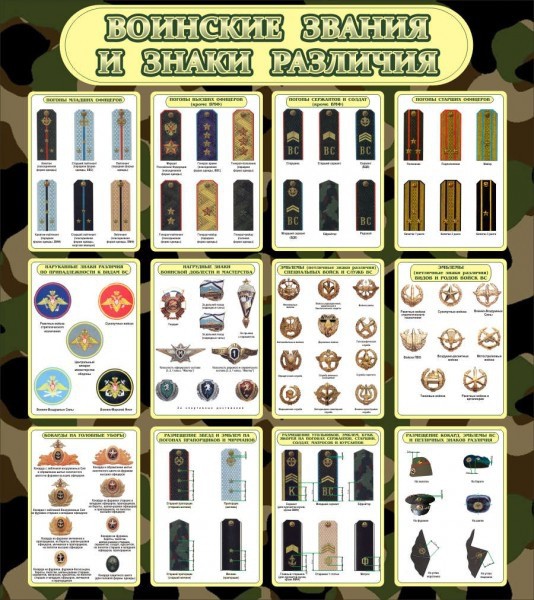 На стенде «Воинские звания и знаки различия» предоставлена вся необходимая информация, которая связана с воинскими званиями и знаками различия под определенную форму одежды и войск. Здесь наглядно показано какие погоны, шевроны и кокарды должны быть у представителей ВС РФ. Стенд позволяет ученикам и курсантам иметь полное представление о воинских званиях и их отличий. Стенд изготовлен из высококачественного материала, обрамленный в декоративные элементы и дополнительно защищен ламинацией. На основании расположены разнообразные погоны, для разной сезонной формы одежды.