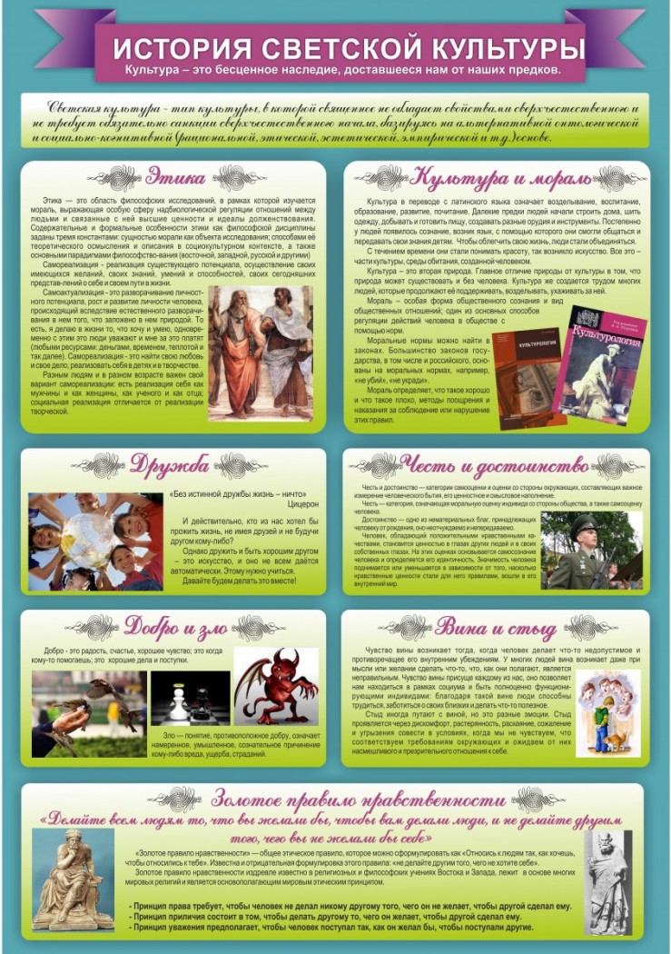 Интересный стенд с наличием ярких картинок и небольших текстов по теме. Всего на стенде семь «ячеек», заполненных сжатой, но ясной информацией. Здесь освещены не только лишь вопросы этики, дружбы и культуры с моралью. Так же ребята смогут прочесть необходимую информацию о добре и зле, достоинстве и чести. Важные чувства вина и стыда, которые зачастую исчезают из сознания современных школьников, так же выделены на этом стенде. В общем-то, золотое правило нравственности, так же выделено курсивом, как и понятия, названные выше.
