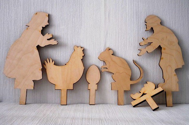 Перед вами – теневой театр «Курочка Ряба», в который входят следующие персонажи: дед, бабка, курочка, мышка, а также яйцо целое и разбитое.