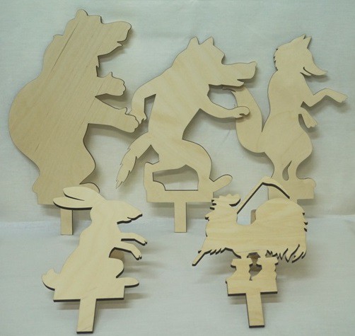 Перед вами – теневой театр «Заюшкина избушка», в который входят следующие персонажи: заяц, лиса, волк, медведь, петух.
