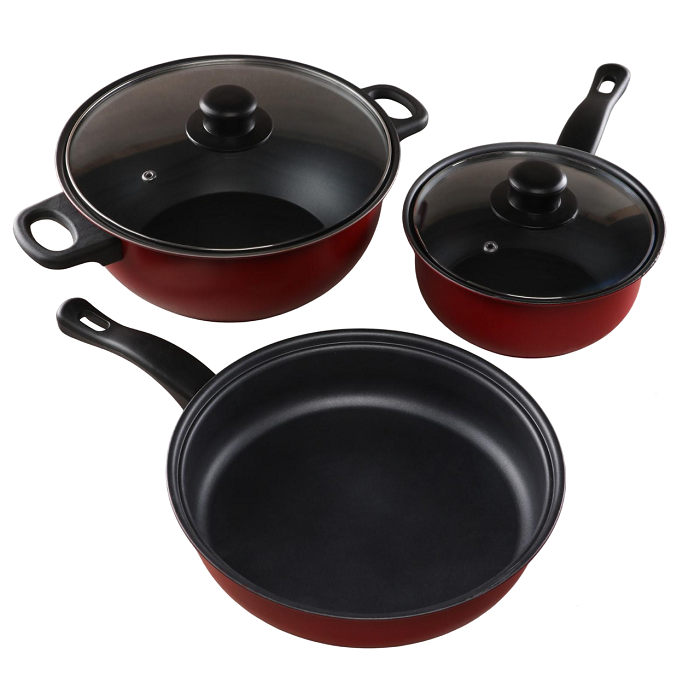 Набор посуды: кастрюля 3 л, d=24 см, ковш 1,3 л, сковорода d=24 см, крышки 2 шт, антипригарное покрытие.