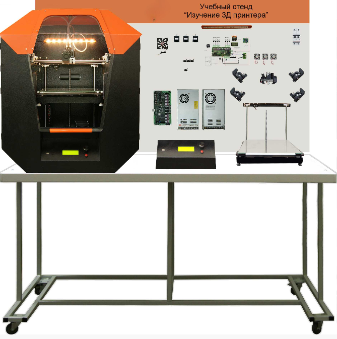Модель учебного стенда представляет собой 3D принтер с печатной головкой (экструдер) для нагрева и выдавливания материала, подогреваемой платформой, размещенный на лабораторным столе с установленными: