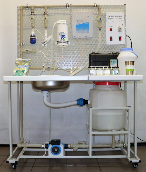 Лабораторная установка позволяет изучать эффективность очистки питьевой воды от примесей с помощью бытовых фильтров. Комплектуется набором химических средств анализа качества воды.