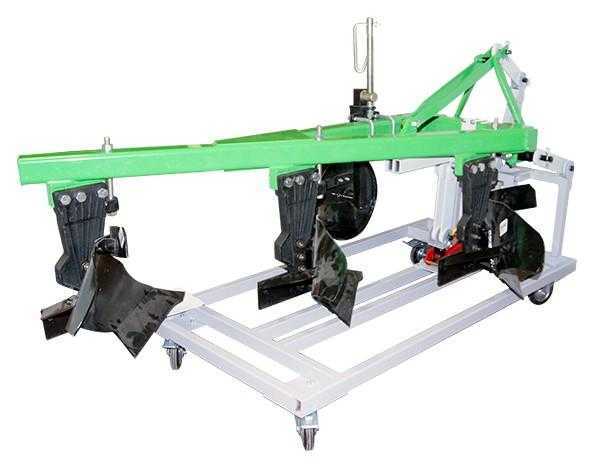 Стенд представляет собой полнокомплектный лемешный навесной 3-х корпусный плуг, закрепленный на стационарном металлическом основании, оснащенным механизмом подъема плуга в виде домкрата. Плуг закреплен на металлическом основании подвижными тягами, имитирующими механизм навески трактора.