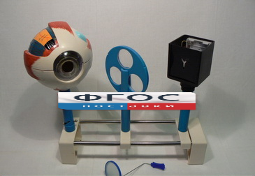 Модель очков представляет собой пластмассовый диск с тремя круглыми лунками, закрепленный на подвижной стойке непосредственно перед роговой оболочкой модели глаза. В лунки вставлены собирающая и рассеивающая линзы и обычное стекло (для сравнения результатов исследований). Модель очков прикреплена к стойке так, что может вращаться вокруг горизонтальной оси. Осветитель представляет собой электропатрон специальной формы, в который ввинчена матовая лампа накаливания. Патрон жестко закреплен внутри непрозрачного кожуха, предотвращающего попадание яркого света от лампы в глаза. Стенка кожуха, обращенная к модели глаза, имеет отверстие в виде стрелки и может отделяться от осветителя. В нижней части патрона находится кнопка включения лампы. Кожух с лампой надевается на подвижную стойку модели. Полупрозрачный экран представляет собой тонкий диск, изготовленный из прозрачного пластика, одна из поверхностей которого сделана матовой. Диск вставлен в оправу. Оправа имеет фигурную ручку. Экран используют для наблюдения изображения, даваемого хрусталиком при демонстрации дефектов зрения.
