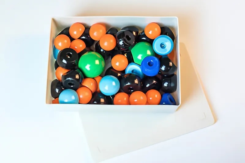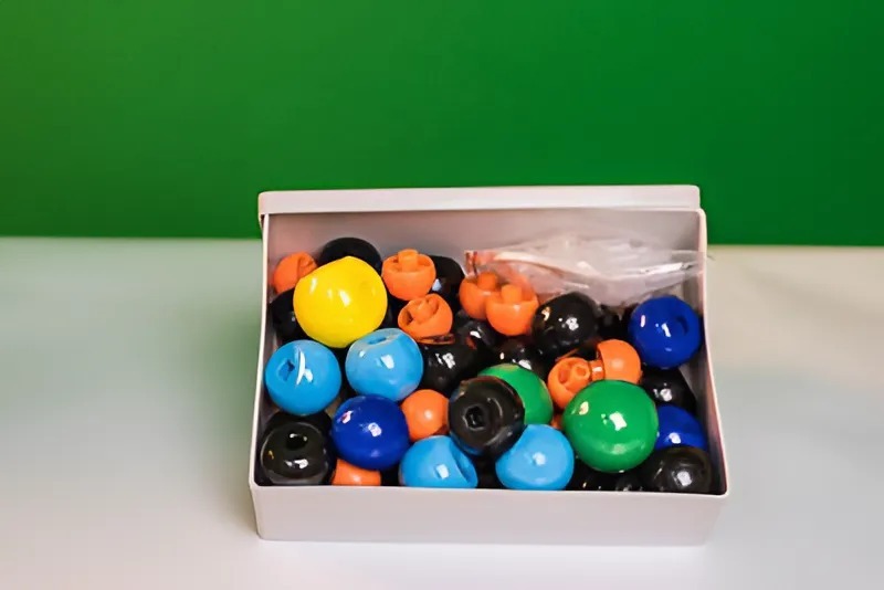 Набор состоит из пластмассовых шаров (моделей атомов) и соединительных втулок. Для удобства работы с моделями применен метод цветового кодирования.