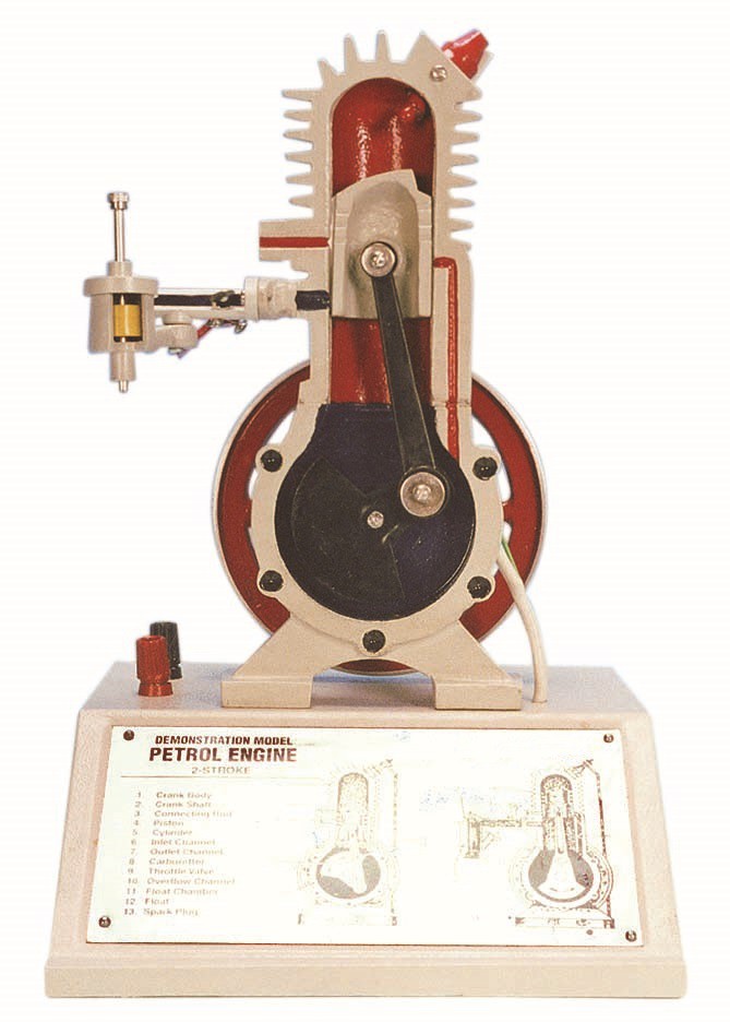 Демонстрирует устройство и принцип работы простого одноцилиндрового бензинового 2-тактного двигателя с воздушным охлаждением.