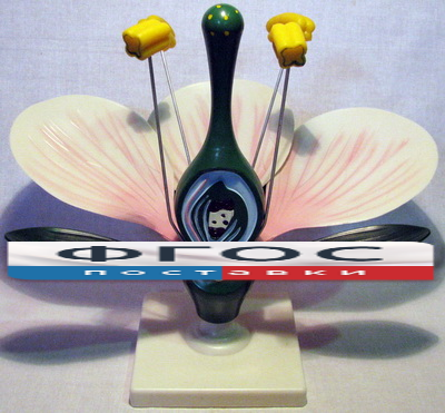 Модель цветная, изготовлена из пластмассы, представляет собой увеличенный цветок яблони в разрезе. Она является цветной, разборной – чашелистики (4шт.) и лепестки (3шт.) вставляются в пазы на цветоложе модели цветка. Модель позволяет рассмотреть особенности внешнего и внутреннего строения цветка яблони, а также внутреннее строение завязи пестика. Высота модели цветка яблони не менее 35 см. На модели можно рассмотреть  следующие детали строения: цветоножка, цветоложе, чашелистики, лепестки венчика, тычинки (тычиночные нити и пыльники), пестик (рыльце, столбик, завязь), пыльцевая трубка, семяпочка, семязачаток, яйцеклетка, центральная клетка.